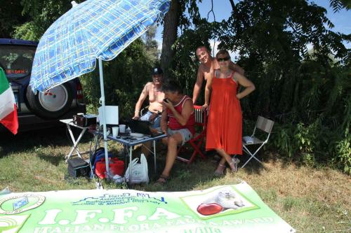 Notiamo subito una linea telefonica, per cui l’antenna viene posizionata nel punto più lontano possibile dai cavi. Betty IK1QFM e Roberto IK1DFH lasciano a Massimo il microfono e l’apertura delle “danze”, così da potersi dividere il pranzetto.